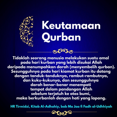 Tidaklah seorang manusia melakukan suatu amal pada hari kurban yang lebih disukai Allah daripada menumpahkan darah (menyembelih qurban). Sesungguhnya pada hari kiamat kurban itu datang dengan tanduk-tanduknya, rambut-rambutnya, dan kuku-kukunya, dan sesungguhnya darah benar-benar menempati tempat dalam pandangan Allah sebelum terjatuh ke atas bumi, maka berkurbanlah dengan hati yang lapang.